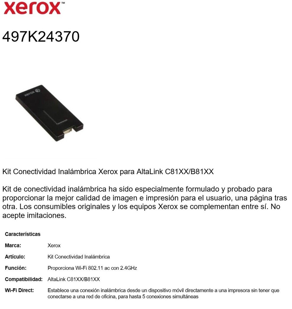 KIT De Conexión Inalámbrica XEROX 497K24370 / Para Impresoras / Hasta 5 Conexiones / Compatible Con AltaLink C81XX/B81XX / Color Negro