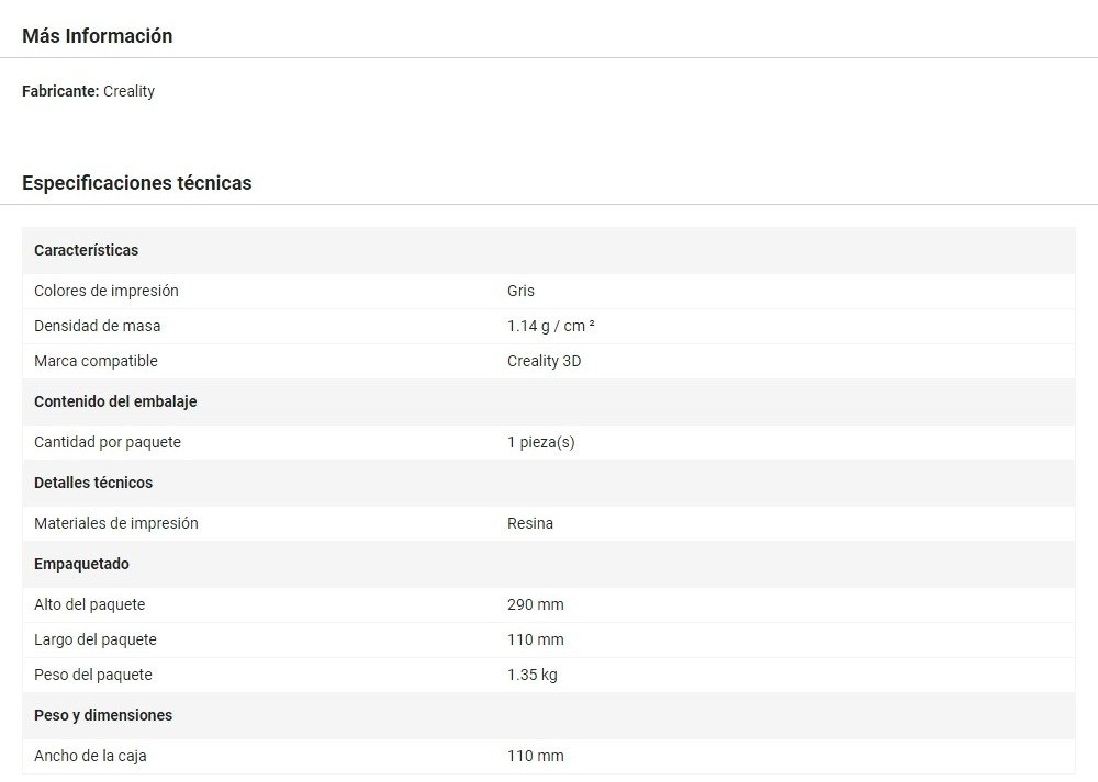 El ancho del paquete mide aproximadamente 110 mm mientras que su altura alcanza los 290 mm. La resina utilizada en este material es compatible con las impresoras Creality 3D, por lo que puede ser utilizado sin problemas en estos dispositivos.