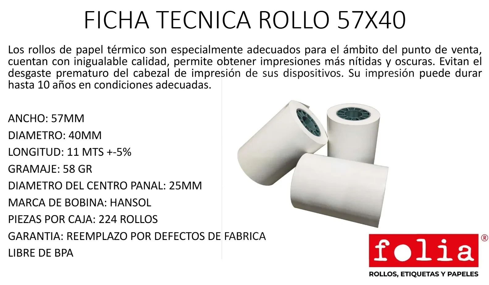 Rollo Térmico FOLIA / 57×40 Mm / Diámetro Del Centro Panal 25mm / Gramaje 58grs / 1 Pieza / Blanco
