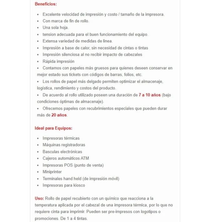 • Uso: Tickets, Registro de datos, Cupones, Recibos, Boucher de transacción bancaria, Estados de cuenta, Facturas, Rollos para cajero ATM, Toma turnos, Facturas, Boletos en general, Delivering