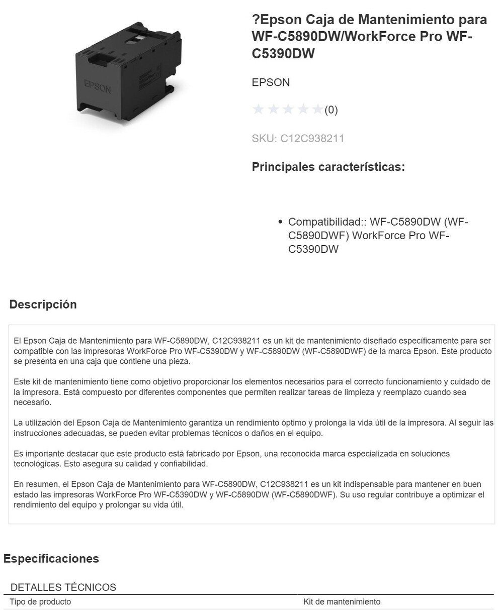 Tanque De Mantenimiento EPSON C12C938211 / Fácil Instalación / Compatible Con WF-C5890DW / WF-C5890DWF / WorkForce Pro WF-C5390DW / Color Negro