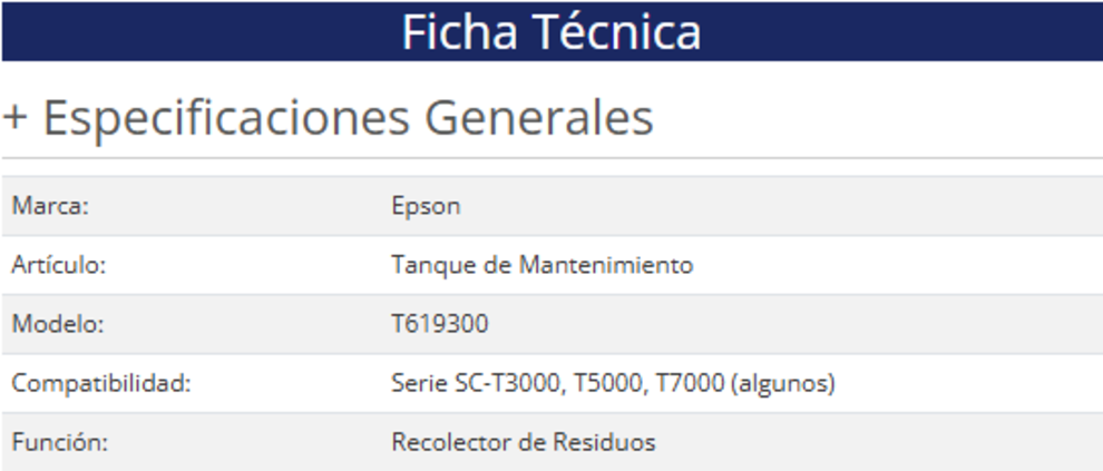 El Epson Tanque de Mantenimiento T619300 es un accesorio diseñado para la Serie T de impresoras Epson, específicamente los modelos SC-T3000/T5000/T7000.