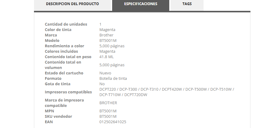 Sé el primero en valorar “Tinta Brother / Magenta / Alto Rendimiento / Hasta 5000 Paginas / Compatible Con Tinta Continua Bt5001m”