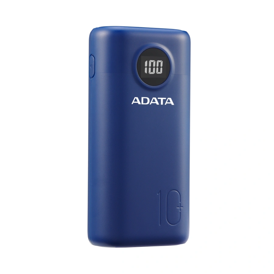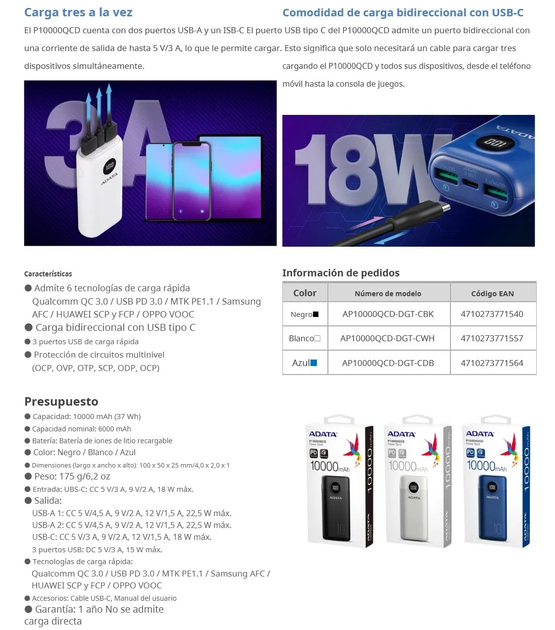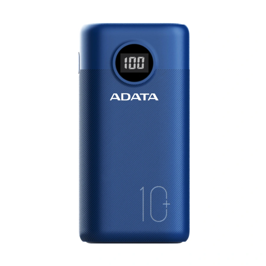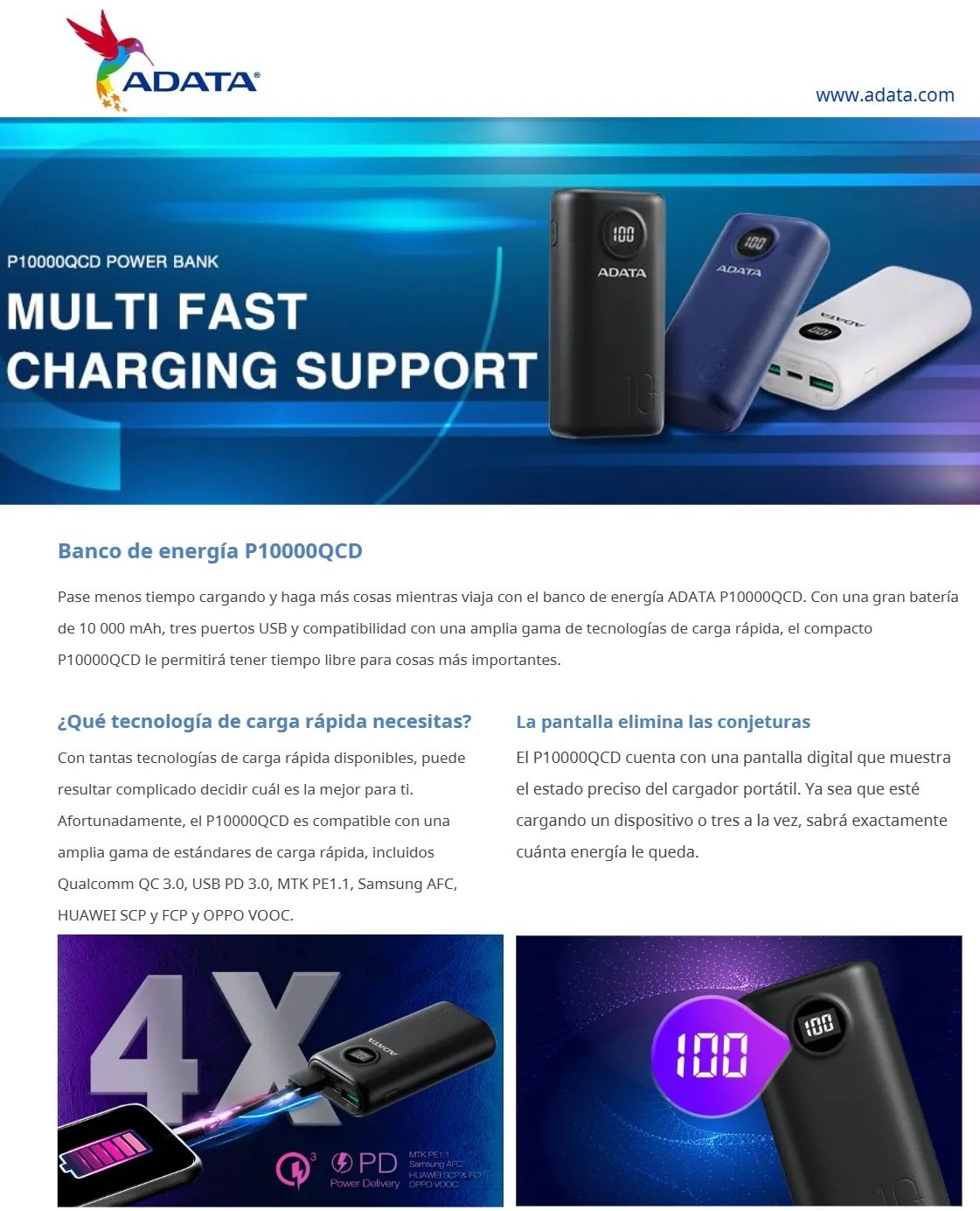 Power Bank ADATA P10000QCD / Con Pantalla Digital / Capacidad 10000mAh / Carga Rápida / 3 Puertos (2 USB, 1 Tipo-C) / Azul