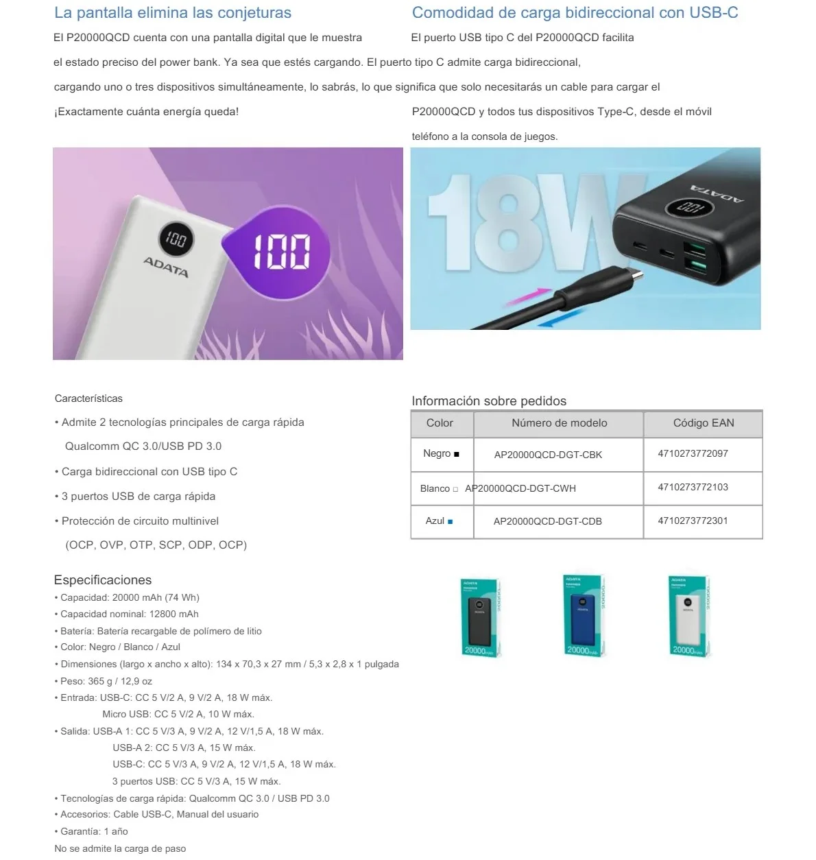 • Con una gran batería de 20 000 mAh, un factor de forma compacto y compatibilidad con Qualcomm QC 3.0 y USB Power Delivery 3.0.