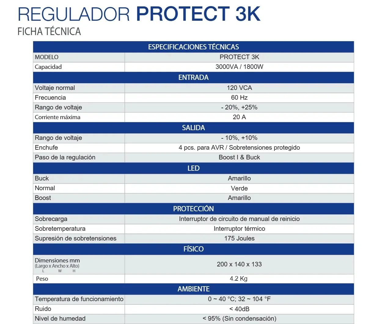 • Rango de voltaje -20%/+25%, Salida; Rango de voltaje -10%/+10%
