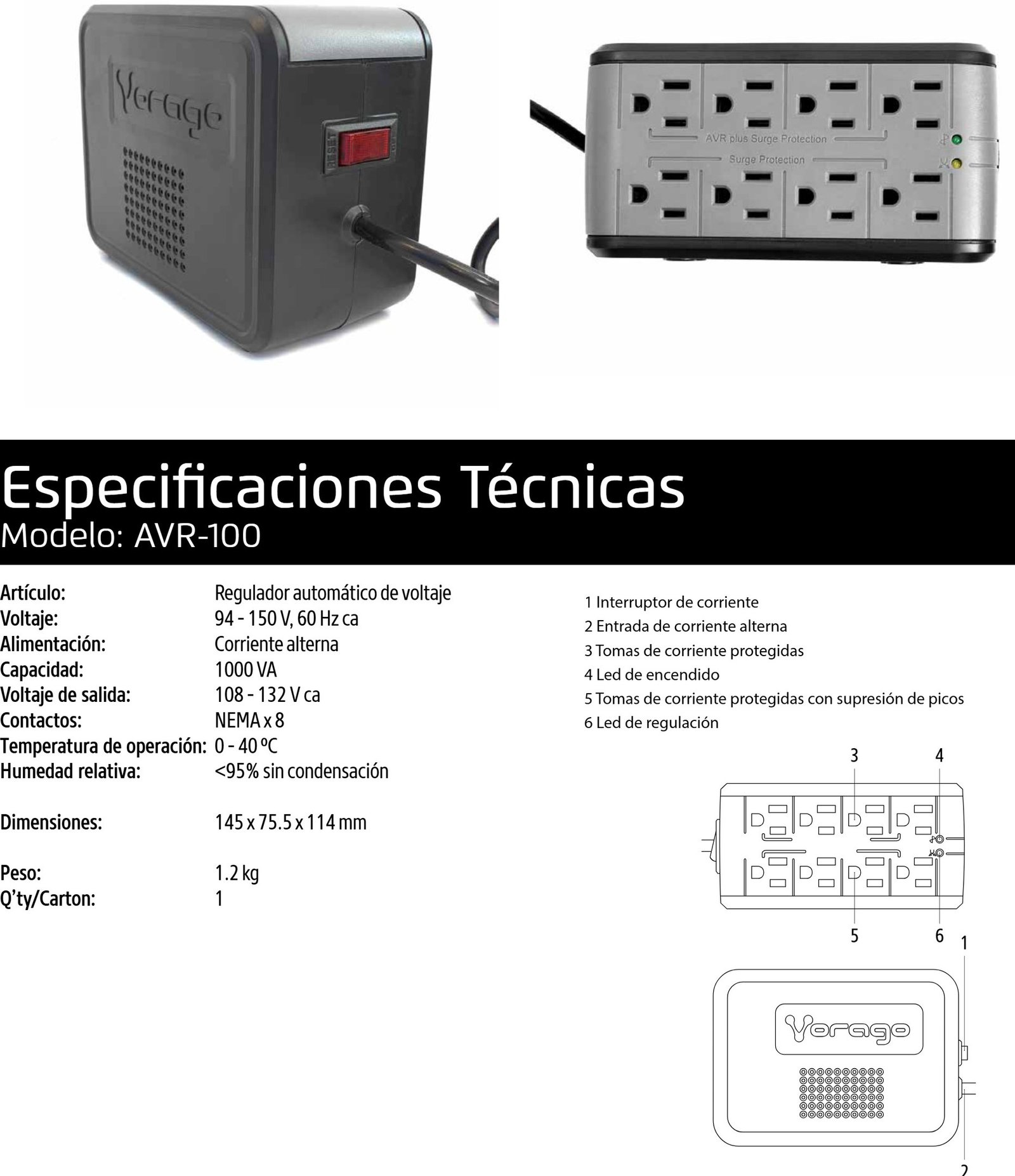 Regulador VORAGO AVR-100 / 480W / Con Led Indicador / Entrada 94V, Salida 132V / 8 Contactos / Supresor De Voltaje / Negro