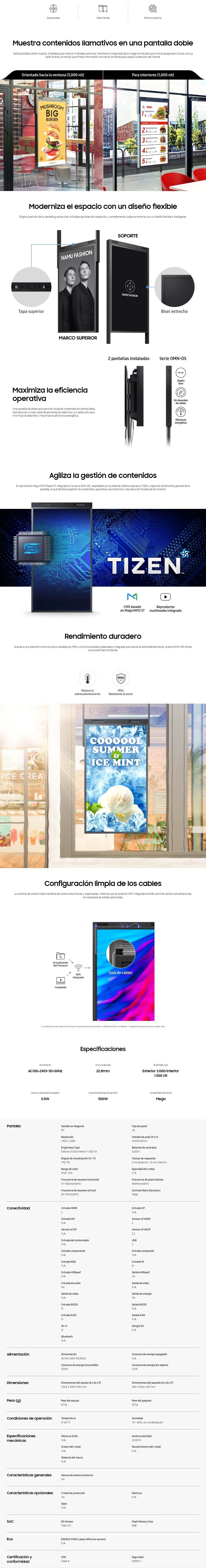 Pantalla Comercial SAMSUNG LH55OMNDSGBXZA / Tizen OS / 55″ / FHD / WIFI / Doble Pantalla / Protección IP5X / RJ45 / X2 HDMI, X2 USB / Negro