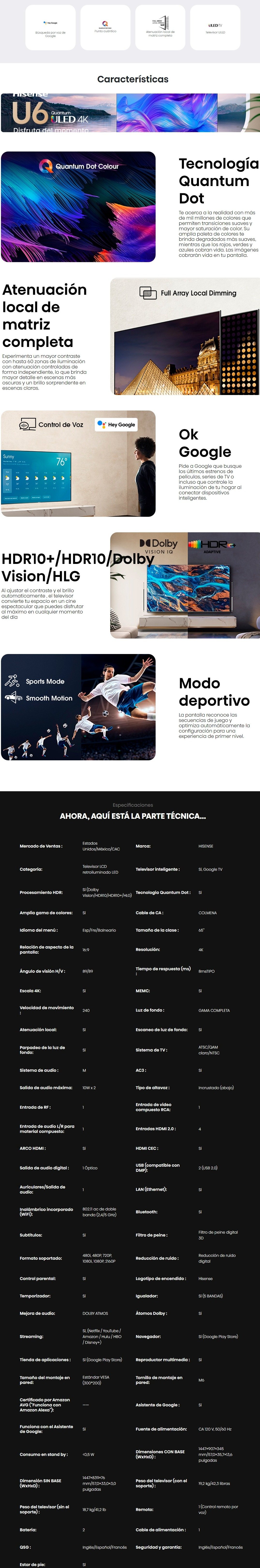 Pantalla Smart TV HISENSE 65U6H / Google TV / 65″ / 4K ULED / WIFI / Bluetooth / RJ45 / Quantum Dot / Dolby Visión / X4 HDMI / X2 USB / 60Hz / Negro