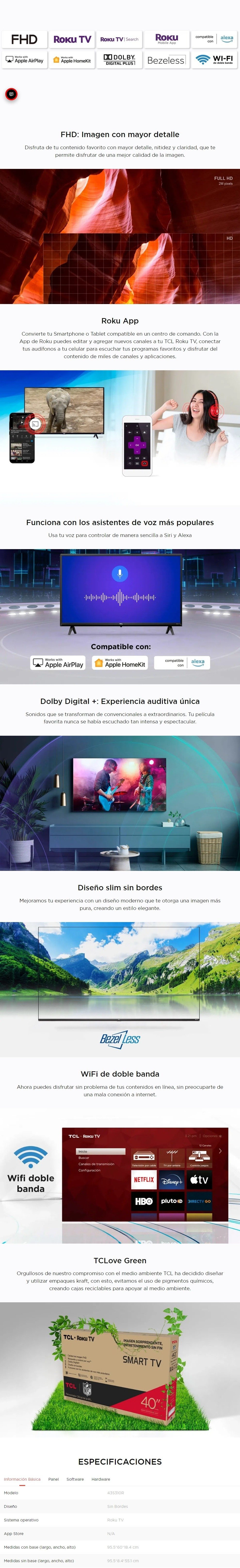 Pantalla Smart TV TCL 43S310R-MX / Roku TV / 43″ / FHD / WIFI / X3 HDMI, X1 USB / 60Hz / Dolby Digital / Compatible Con Siri Y Alexa / Negro