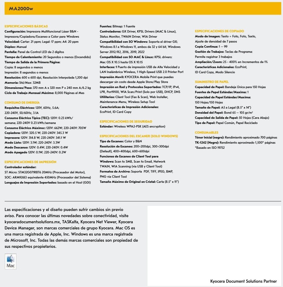 Impresora Láser KYOCERA MA2000w / 21 PPM / Láser / USB, Wi-Fi, Ethernet / 600X600 dpi / Blanco Y Negro / Escaneo A Color / Hogar, Oficina / Color Negro