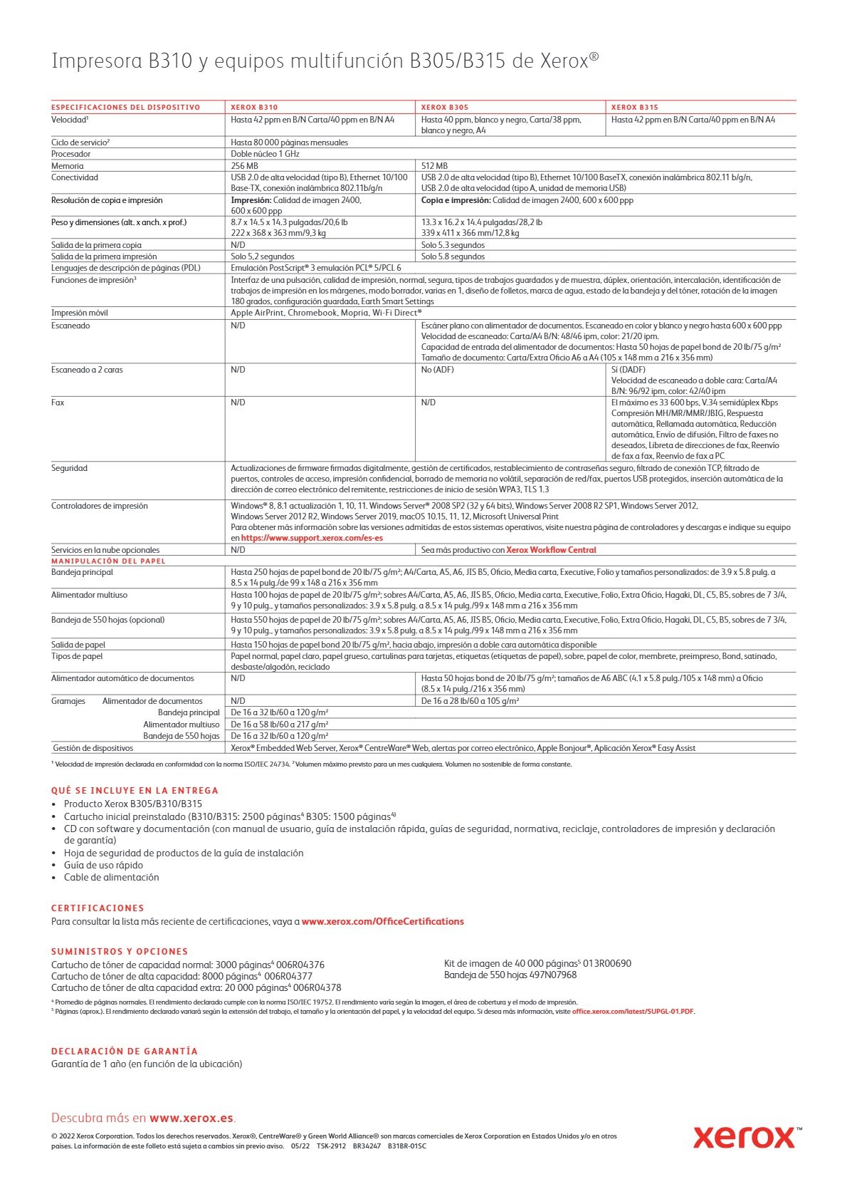 Impresora Láser XEROX B310 / 42 PPM / 600X600 PPP / Monocromática / USB 2.0 Ethernet, Apple AirPrint, Chromebook, Mopria, Wi-Fi / Carta,Oficio / Hogar, Oficina / Color Blanco