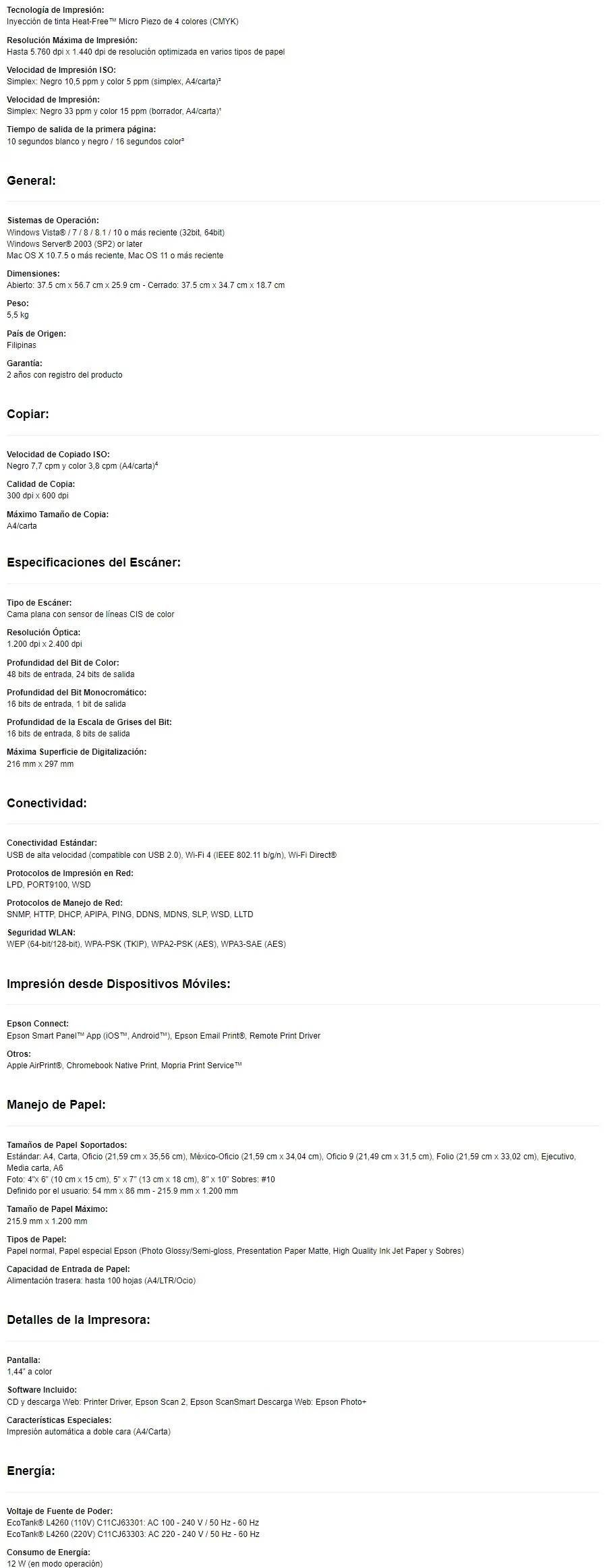 La impresora multifuncional 3 en 1 L4260 para emprendedores y pequeñas oficinas ofrece funciones de productividad a un precio asequible, como la tecnología de impresión a doble cara automática, conectividad Wi-Fi y compatible con nueva aplicación Epson Smart Panel, para aprovechar toda la productividad de su impresora a través de sus dispositivos inteligentes. Cuenta con la tecnología sin calor Epson Heat Free, que brinda un desempeño eficiente, ayudándolo a aumentar la productividad de su negocio y le ofrece la posibilidad de imprimir a color, por menos de lo que cuesta imprimir en blanco y negro en una impresora láser monocromática. La L4260 utiliza tinta negra pigmentada, la cual tiene una alta resistencia al agua, a la decoloración y a las manchas para mejor preservación de documentos de texto. Ideal para aquellos que buscan minimizar sus costos operativos de impresión y el consumo de papel con la conveniencia y confiabilidad que ofrece EcoTank, líder en impresión con tanques de tinta. Con una garantía limitada y extendida hasta de 2 años5, Epson lo respalda totalmente para que pueda imprimir sin cartuchos y sin preocupaciones.