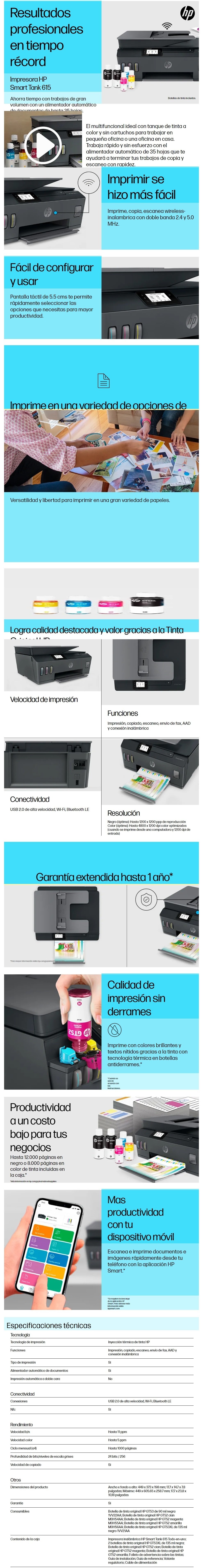 Impresora Multifuncional HP SMART TANK 615 / Inyección Térmica De Tinta / Color 5ppm / B/N 11ppm / USB, Wifi, Bluetooth LE / Impresión, Copia, Escaneado, Fax / Negro