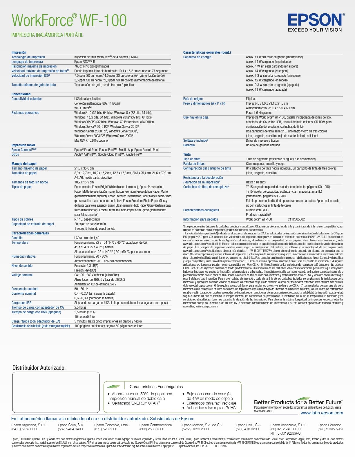 • Imprima donde sea que lo lleve su negocio con la WorkForce® WF-100, la impresora ideal para profesionales en movimiento: lo último en portabilidad con conectividad inalámbrica incorporada y Wi-Fi Direct®1. Con gran velocidad y tintas de secado rápido, la WF-100 es perfecta para imprimir en cualquier lugar y en cualquier momento. Puede imprimir facturas, contratos y mucho más desde su iPad®, iPhone®, tableta, teléfono inteligente o computadora portátil2.