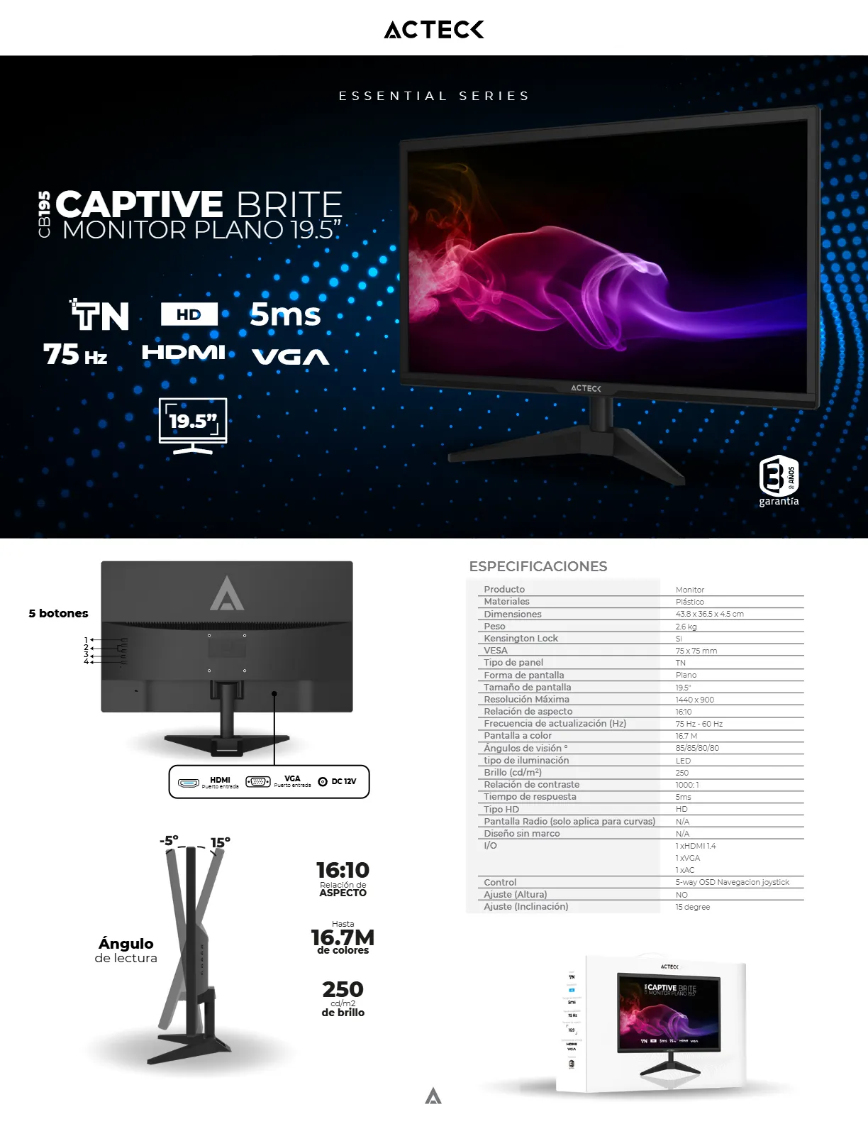 Monitor ACTECK AC-939409 / 19.5″ / 75Hz / 250 cd / m² / 1600 x 900 HD / Panel TN / VGA, HDMI / 5MS / Negro