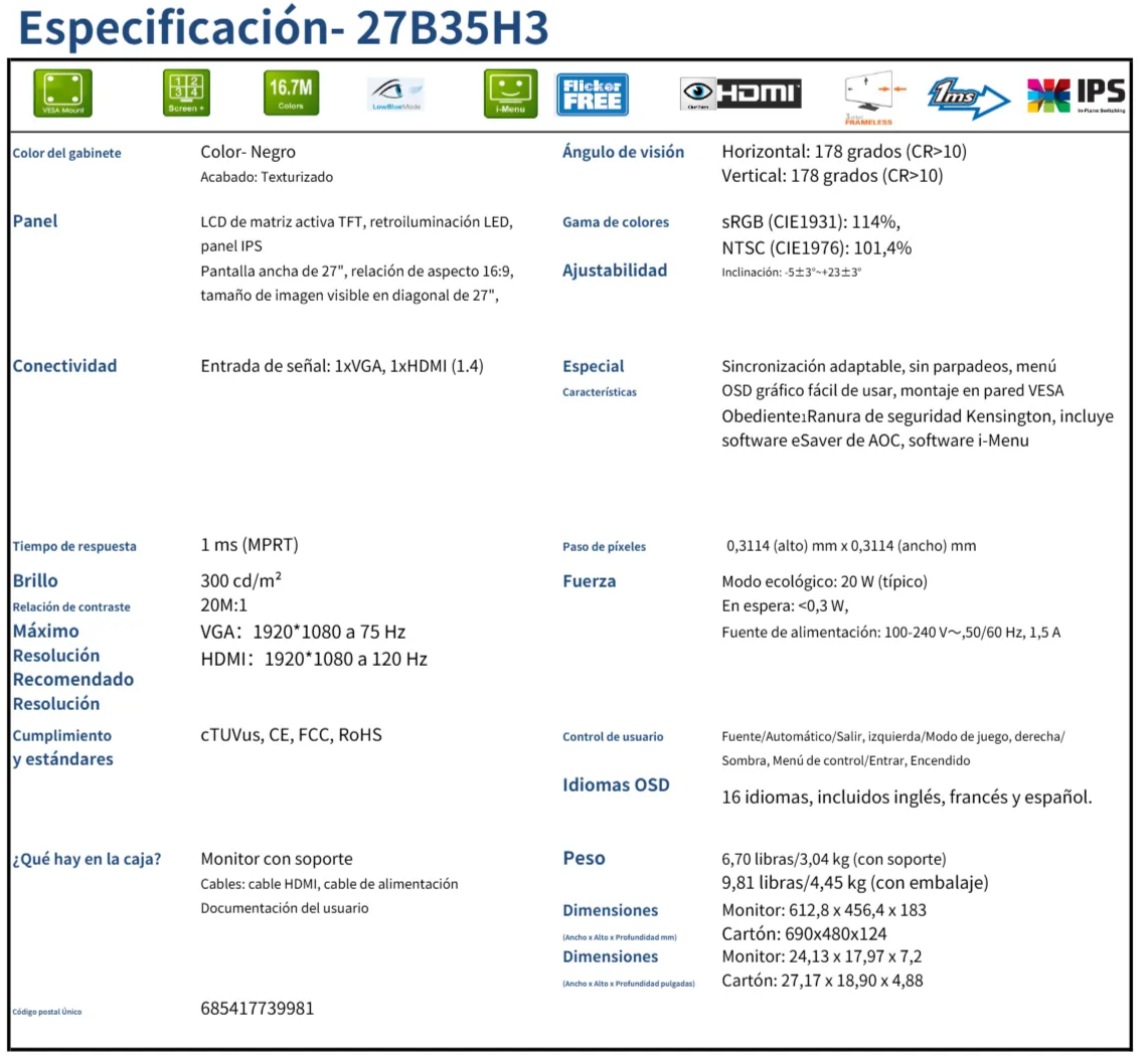 Monitor AOC 27B35H3 LED 27″ – 1920 x 1080 Full HD, Panel IPS, 120Hz, Hdmi, Vga, 1MS, Vesa, Adaptive Sync, HDR MODE, Negro