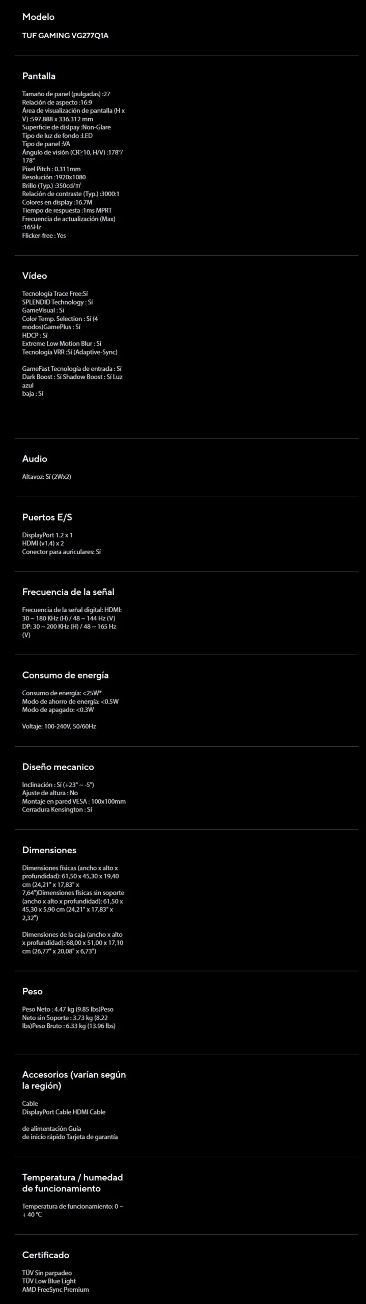 Monitor ASUS TUF GAMING VG277Q1A / 27” / Full HD 1920 x 1080P / 165HZ / Panel VA / 1MS / Dp, Hdmi / Bocinas Integradas / FreeSync Premium / Adaptive-Sync / Low Blue Light / Negro