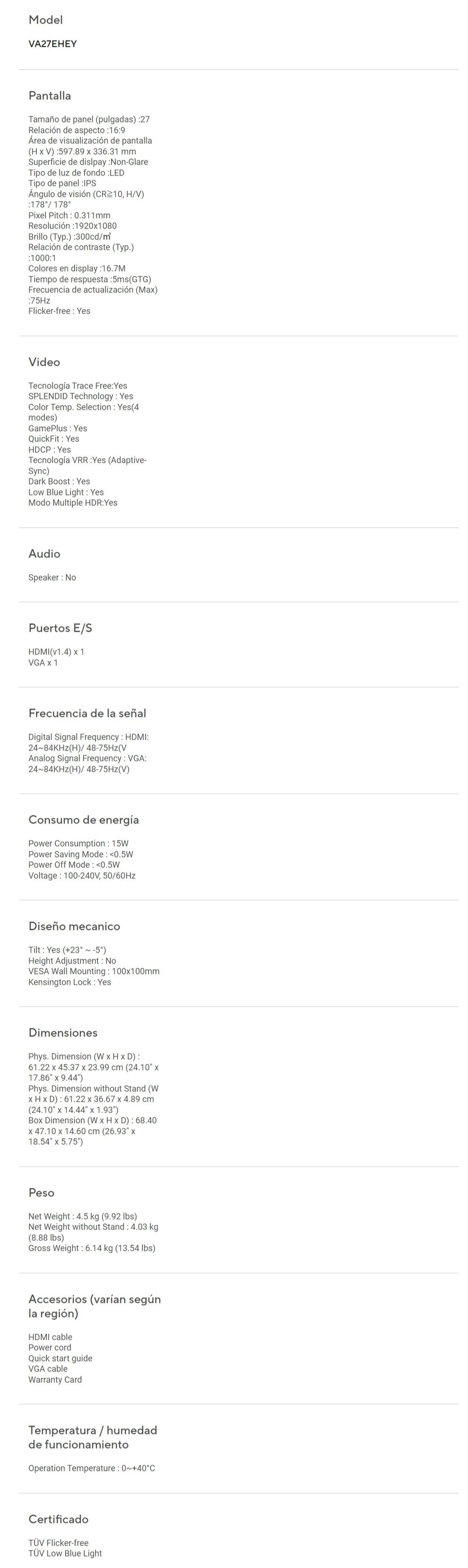 Monitor ASUS VA27EHE / 27″ Ips / Freesync / 1920 X 1080 / 75HZ / 5MS / Panel IPS / Vga-Hdmi / Adaptative-Sync / Negro