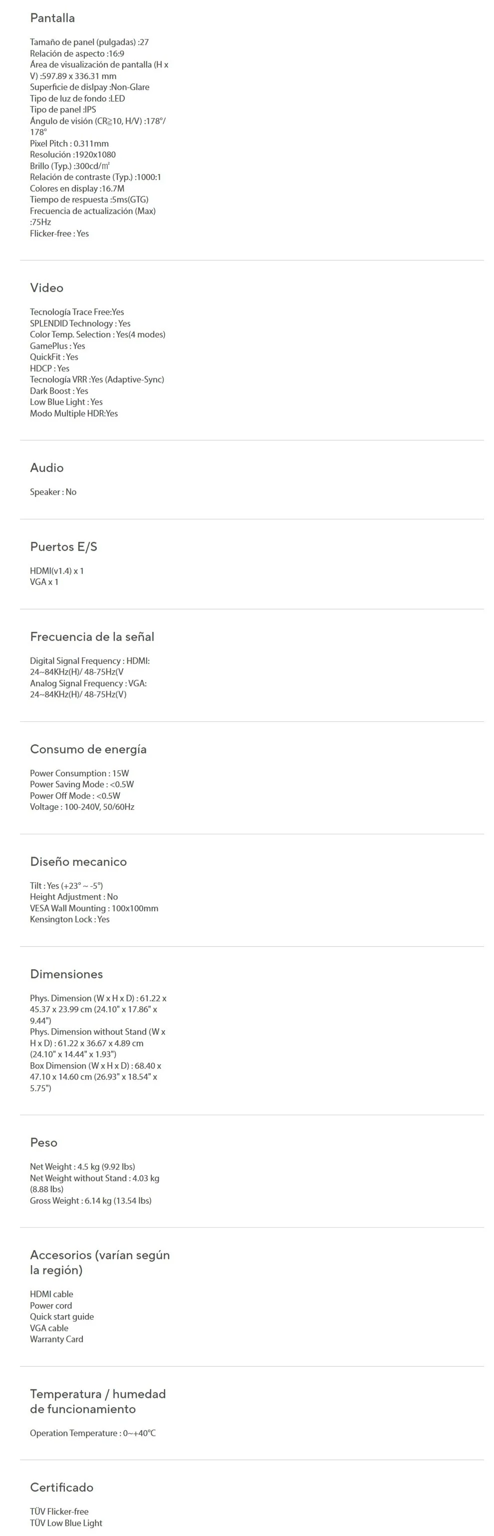 • Pantalla de retroiluminación LED Full HD (1920×1080) de 27 pulgadas con panel de ángulo de visión IPS 178 ° de ancho