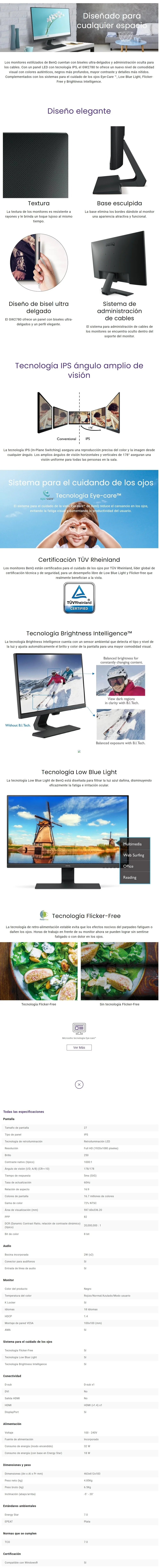 Monitor Benq GW2780 / 27″ / Panel IPS / 60HZ / 5MS / Dp, Hdmi / 1920 X 1080 / Tecnología Eye-Care / Bocina / Negro