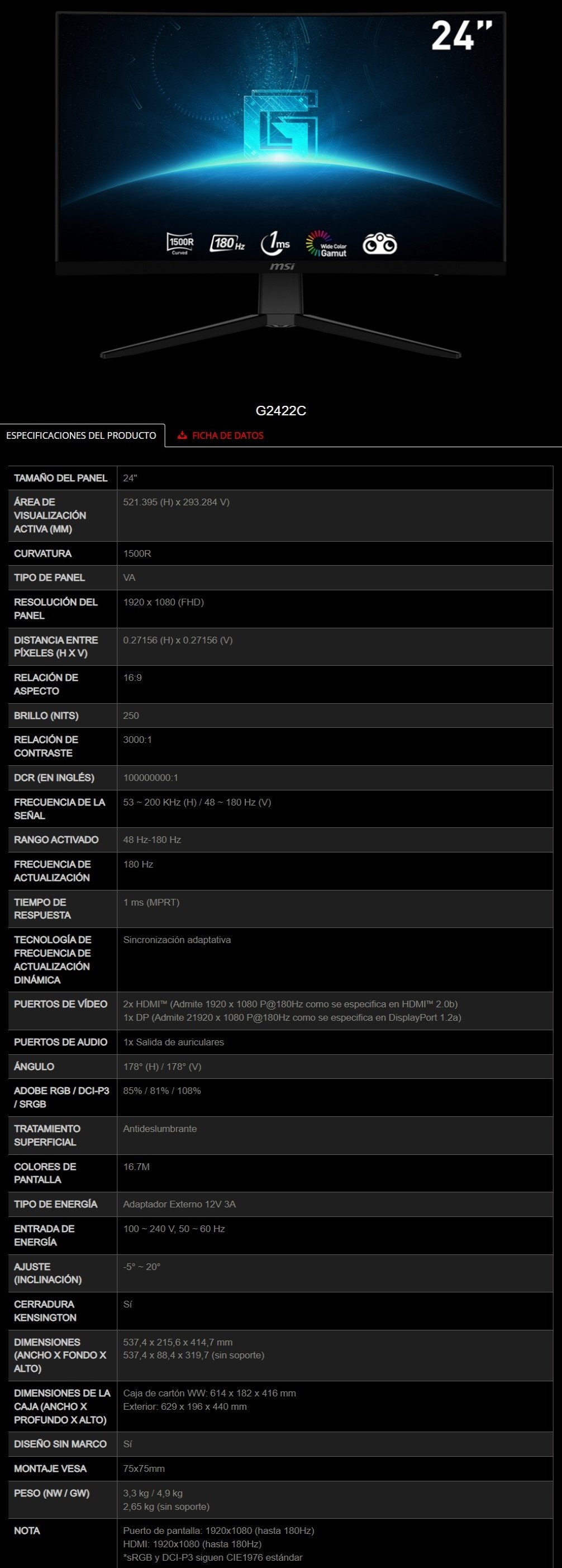 Monitor Curvo Gamer MSI G2422C / 24″ / 1920 X 1080 FHD / 180Hz / 1ms / HDMI, DP, 3.5 mm / Panel VA / Adaptive Sync / Negro