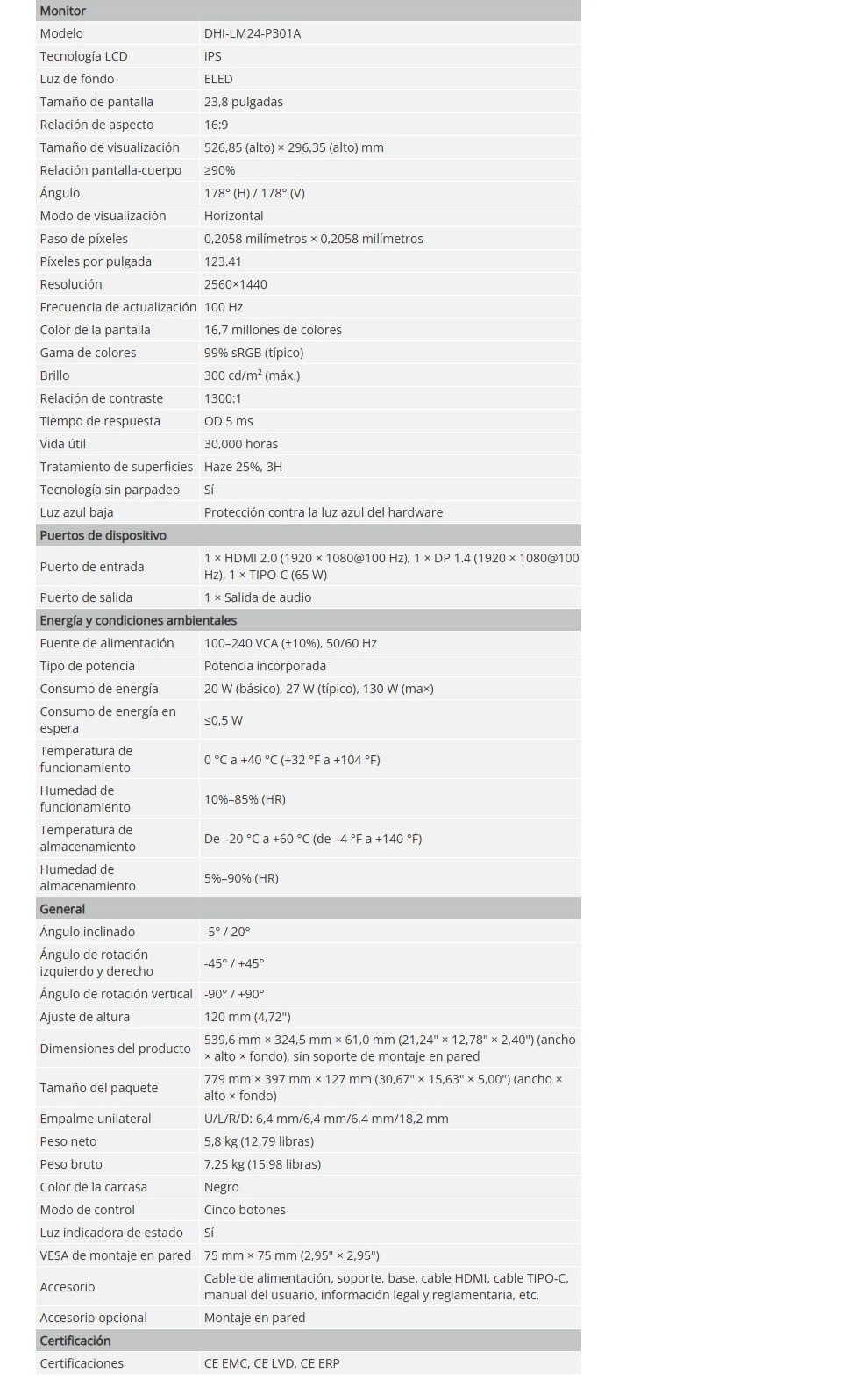 Monitor DAHUA LM24-P301A LED 23.8″ – 2560×1440 Quad HD, Panel IPS, 75Hz, Hdmi, Dp, 1MS, Vesa, Sin Bordes, Negro