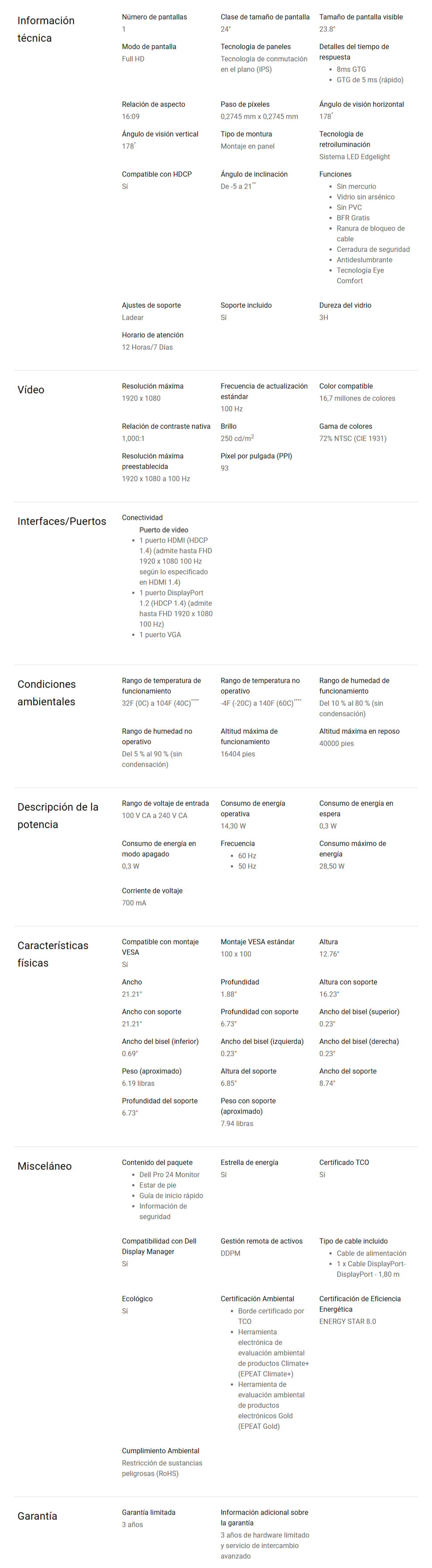 Monitor DELL PRO E2425HM 23.8” – 1920 x 1080 Full HD, Panel IPS, 100 Hz, Hdmi, Dp, Vga, 5MS, Sistema LED Edgelight – Color Negro
