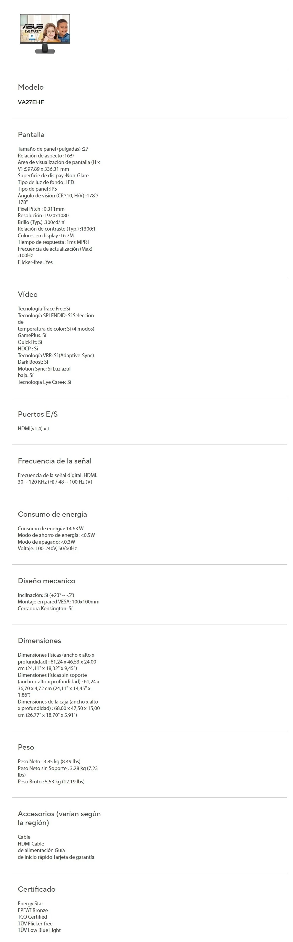 Monitor Gamer ASUS Eye Care VA27EHF / 27″ / 1920×1080 FHD / 100Hz / Panel IPS / 1MS / HDMI / Adaptive-Sync, Flicker-Free, Low Blue Light / Negro