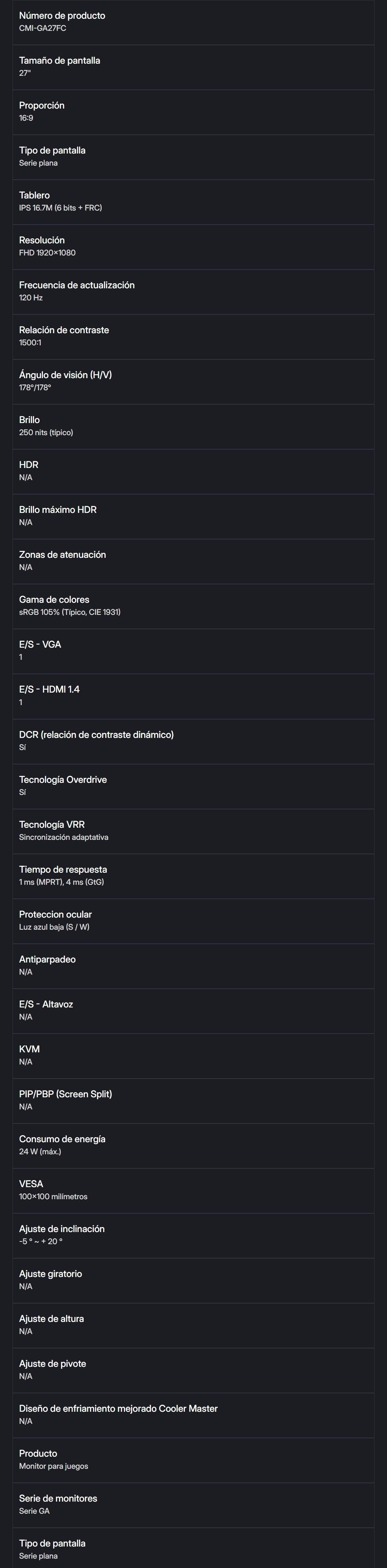 Monitor Gamer Cooler Master GA27FC LED 27″ – 1920 x 1080 FHD, Panel IPS, 120Hz, 1MS, Adaptive Sync, HDMI-VGA, Vesa, Sin Bordes, Negro