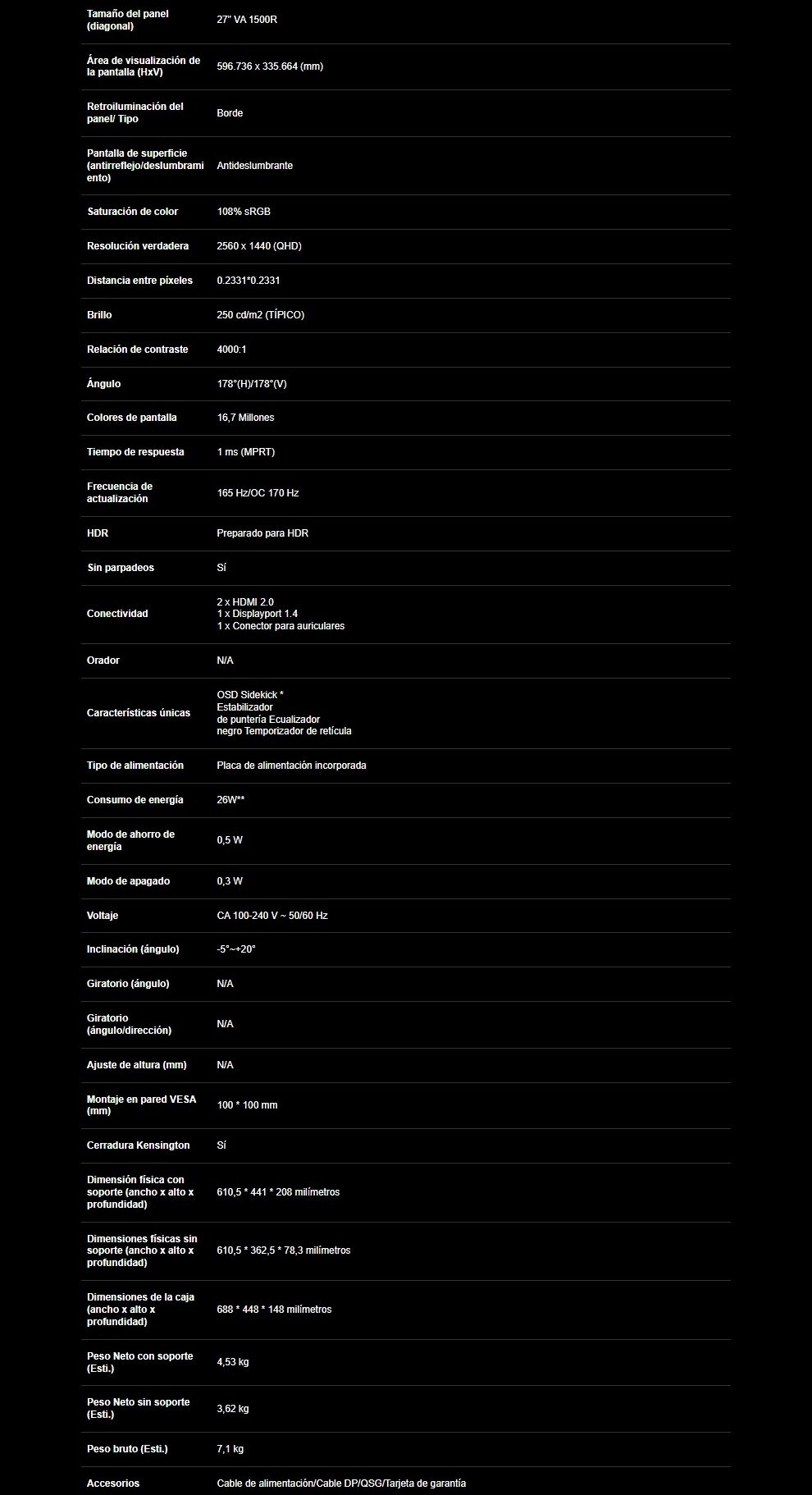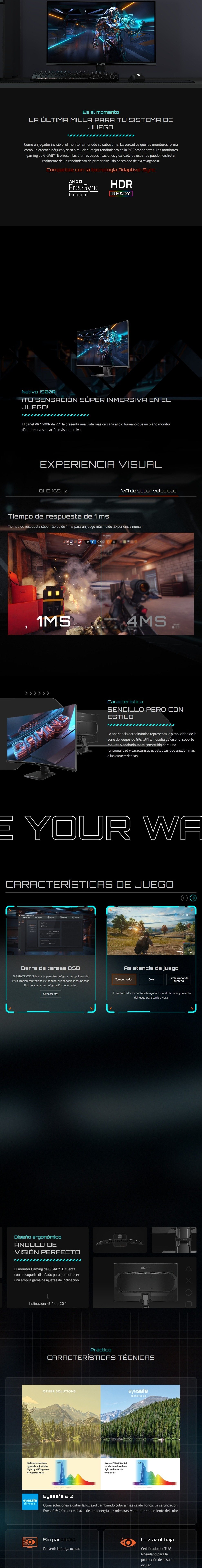 Monitor Gamer Curvo GIGABYTE GS27QC / 27” / 2560 X 1440 FHD / 165Hz / Panel VA / 1MS / X2 HDMI, X1 DP/ Freesync Premium / Negro
