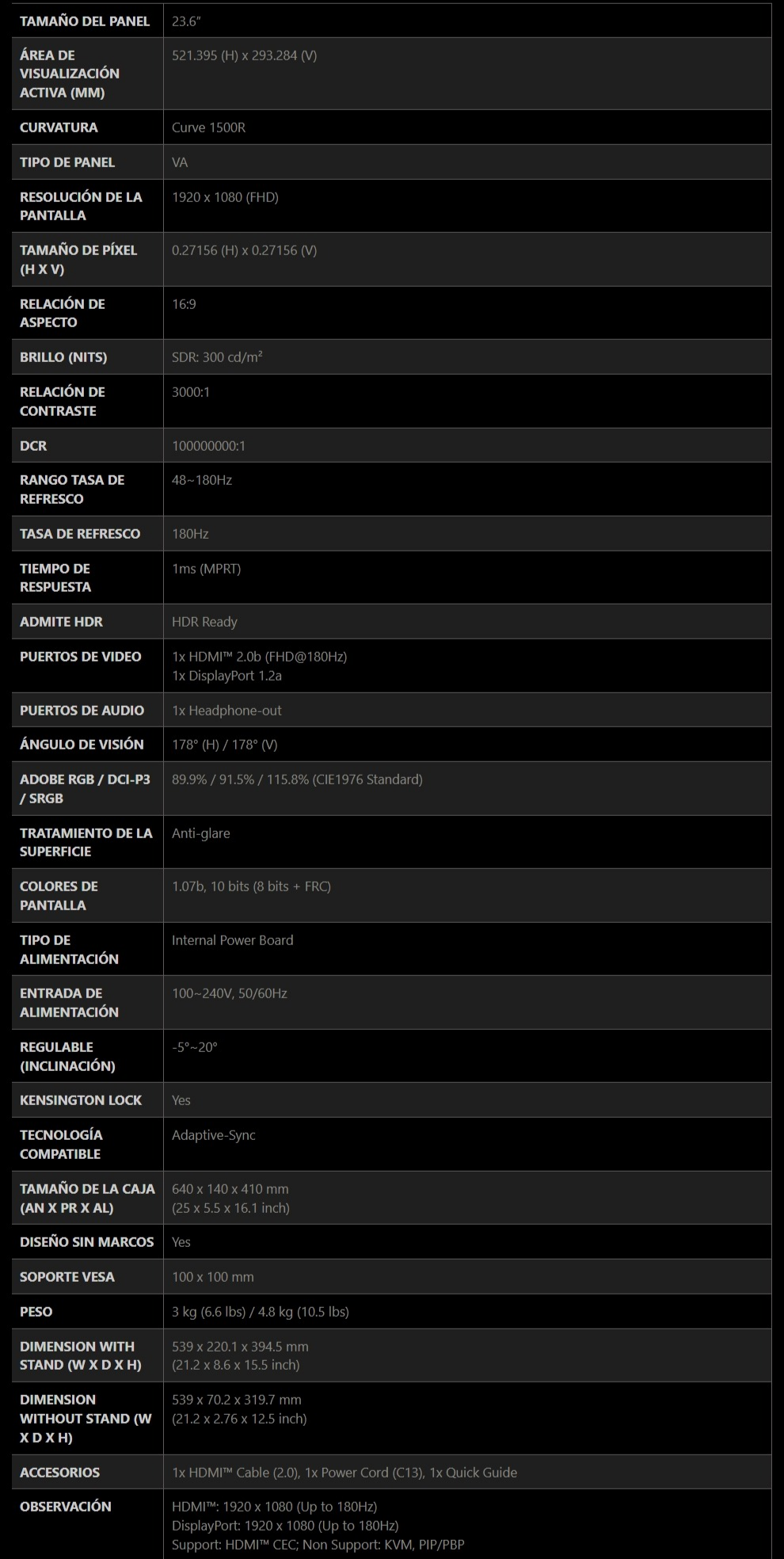 Diagonal de la pantalla: 59.9 cm (23.6″)