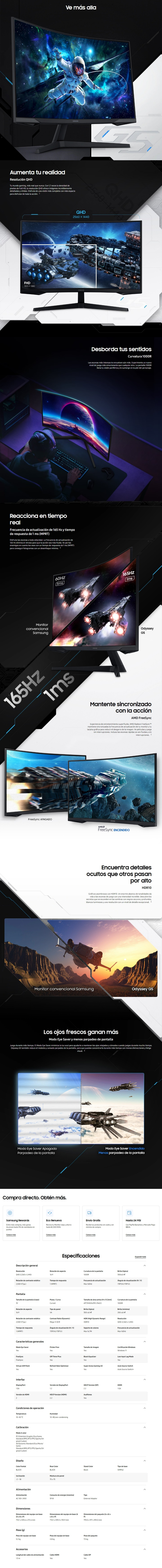 Monitor Gamer Curvo SAMSUNG Odyssey G5 G55C LED 32″ – 2560 x 1440 QHD, Flicker Free/FreeSync/Modo Eye Saver, Panel VA, 165Hz, Hdmi, Dp, 1MS, Vesa, Sin Bordes, Negro