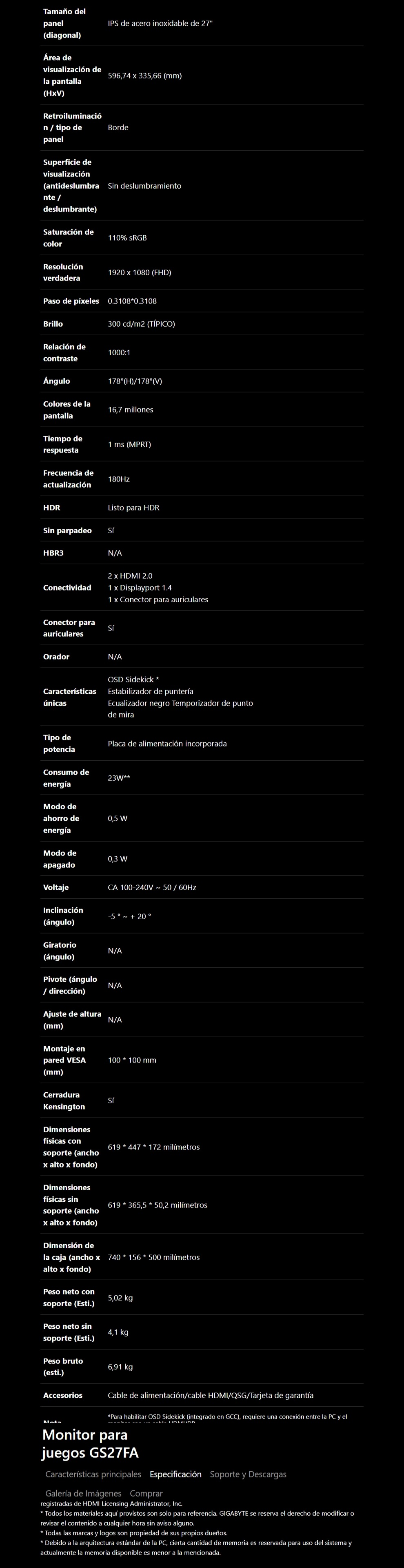 Monitor Gamer Gigabyte GS27FA LED 27″ – 1920 x 1080 Full HD, Panel IPS, 180Hz, Hdmi, Dp, 1MS, Vesa, Negro