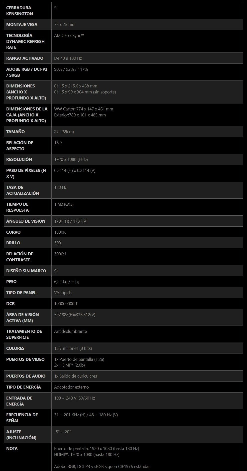 Monitor Gamer MSI G27C3F / 27″ / 1920X1080 / 180Hz / Panel VA / Curvo / 1MS / HDMI, 3.5 MM / AMD Freesync / Montaje VESA / Filtro De Luz Azul / Anti-Flickering / Negro