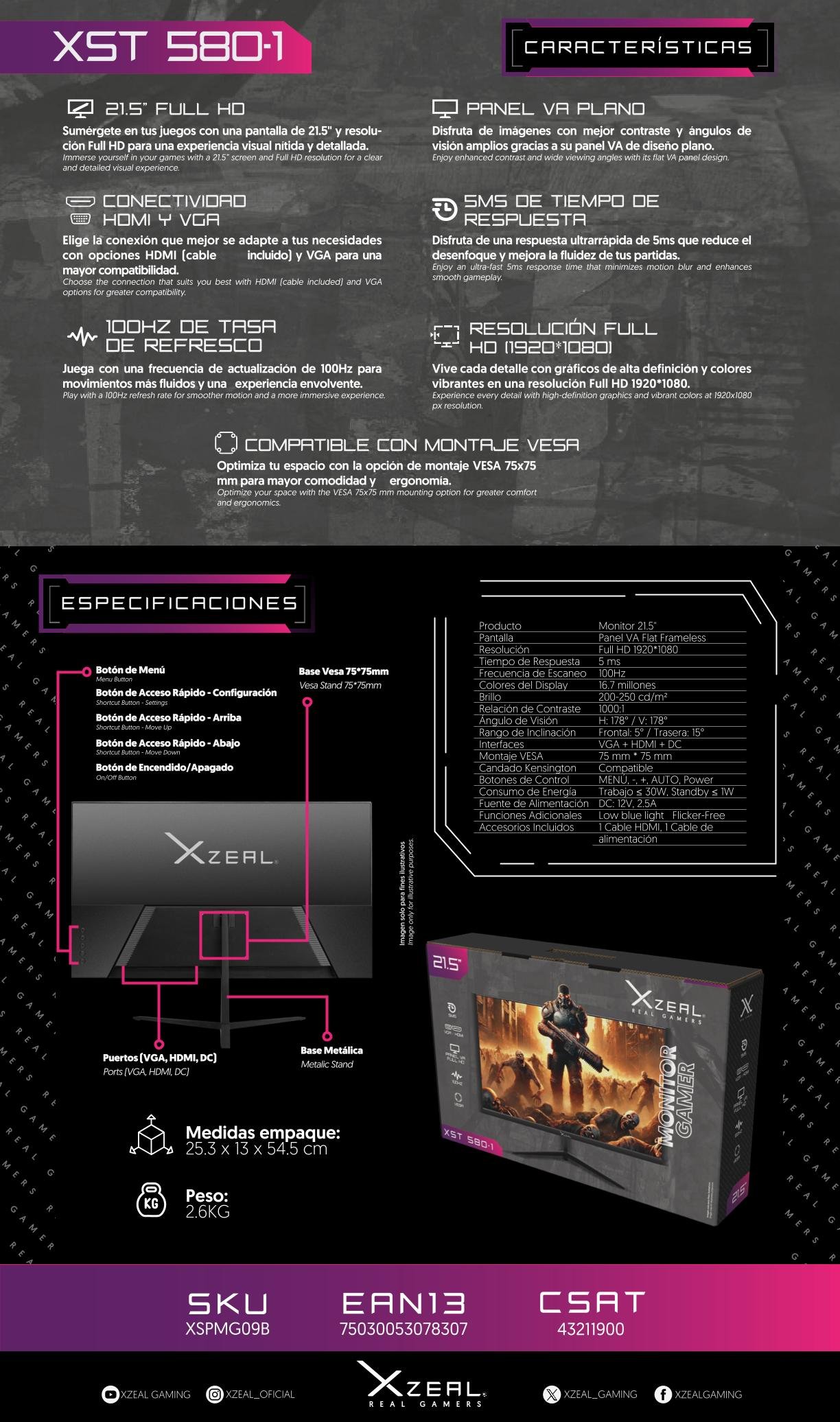 Monitor Gamer Xzeal XST 580-1 LED 21.5″ – 1920 x 1080 Full HD, Panel VA, 100Hz, HDMI, VGA, 5MS, Vesa, Sin Bordes, Ultra Slim, Negro