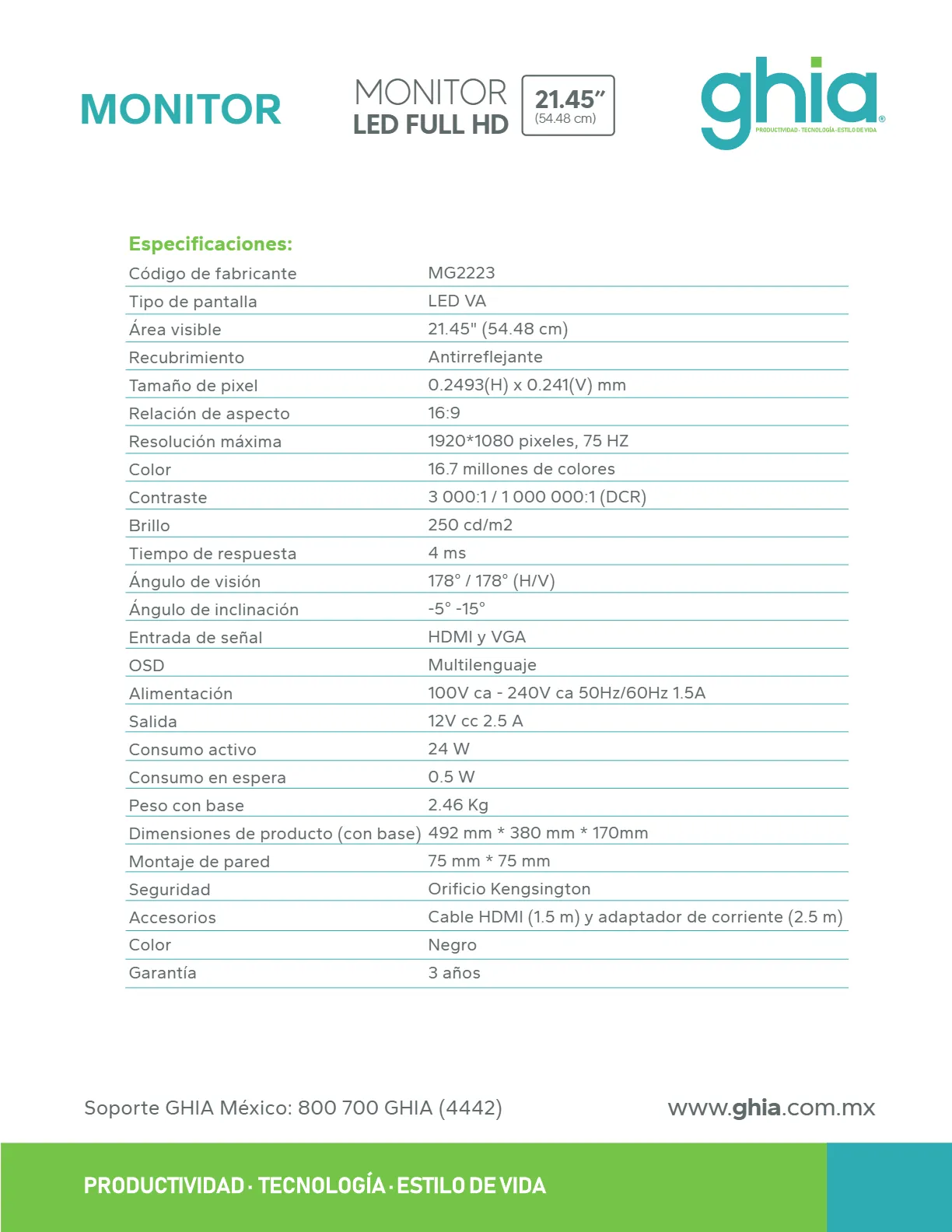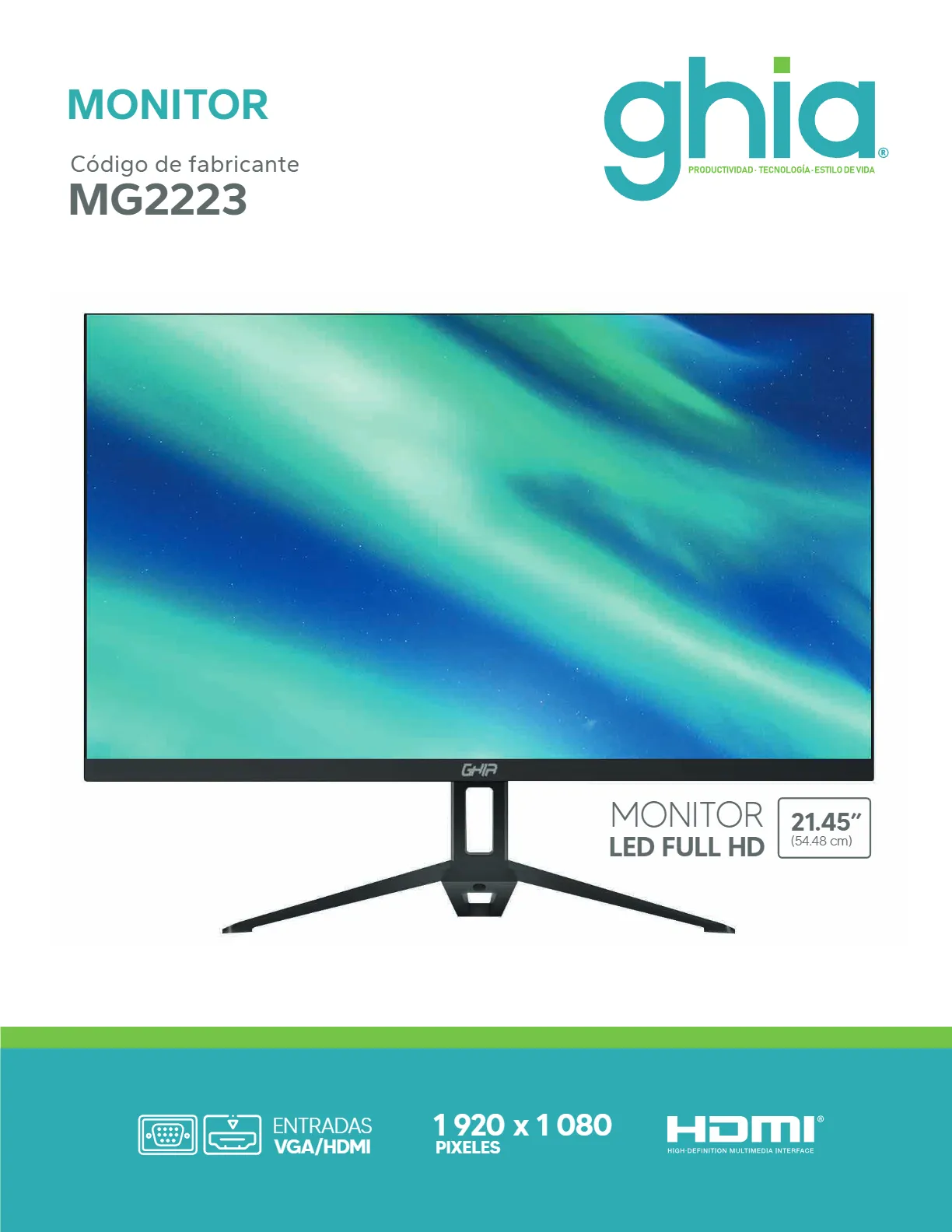 • El monitor GHIA MG2223 LED es un dispositivo de 21.5 pulgadas con resolución Full HD y una frecuencia de actualización de 75Hz