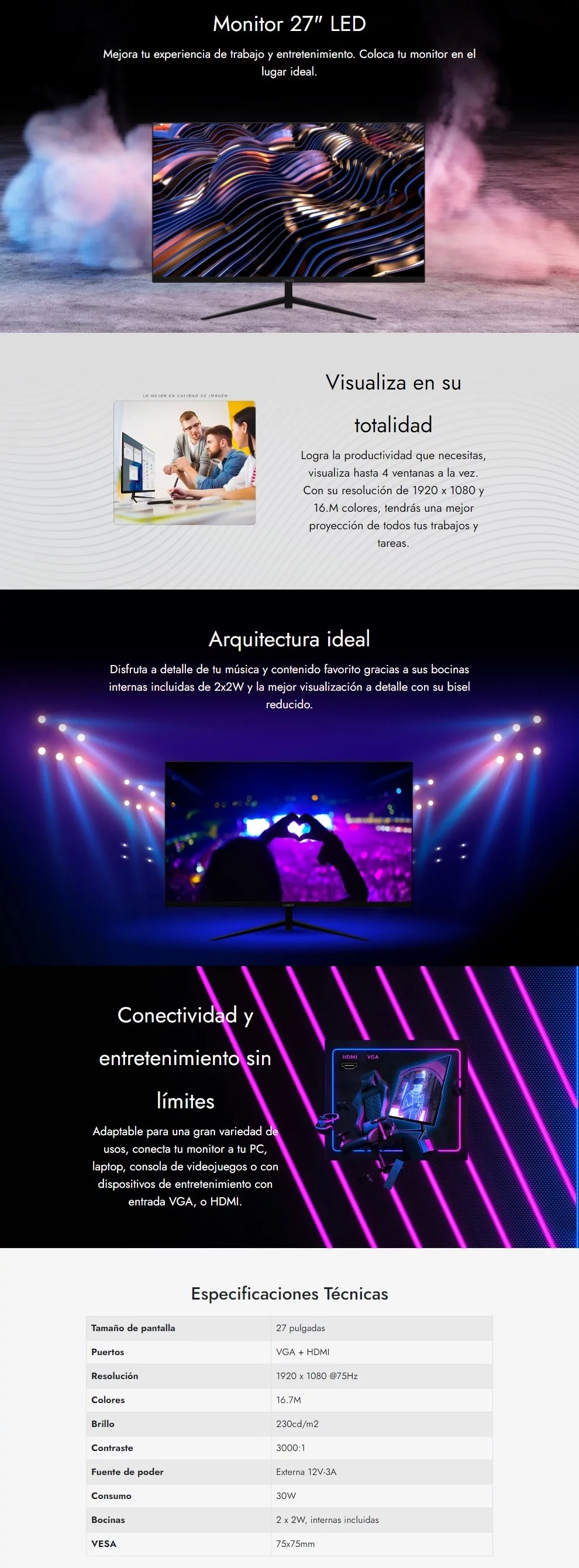 Monitor LANIX LX270 / 27″ Full HD 1920×1080 Pixeles / LED / 75Hz / 8ms / VGA + HDMI 1.4 + SPK / Negro