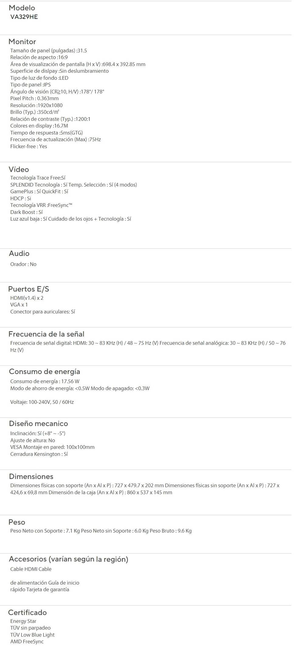 Monitor Led ASUS VA329HE / 31.5″ / 1920 X 1080 Full HD / IPS / 75HZ / 5MS / Hdmi, Vga / Eye Care / FreeSync / Negro