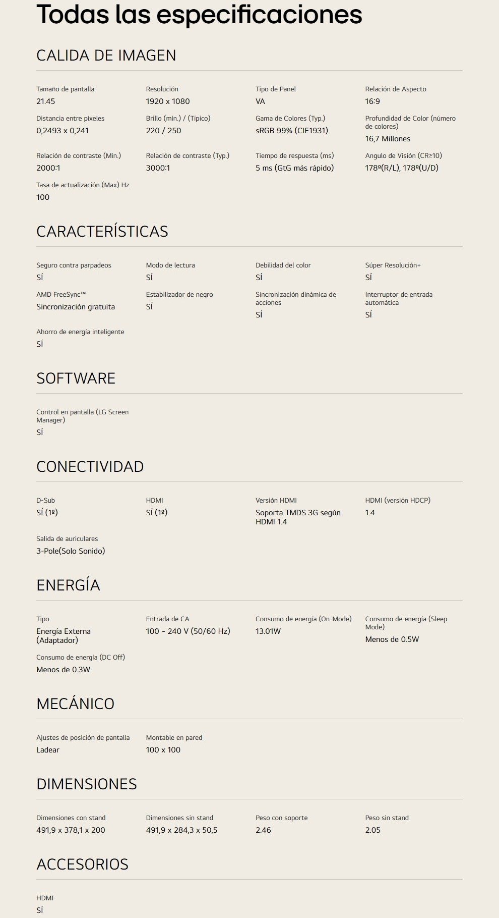 Monitor LG Full HD Con AMD FreeSync / 21.45″ / 1920X1080 FULL HD / 100Hz / Panel VA / 5ms / HDMI, VGA / Color Negro