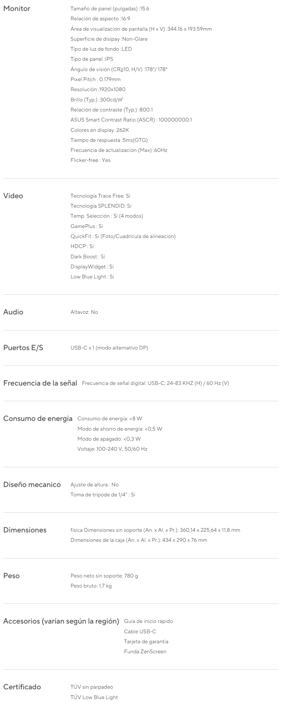Monitor Portatil ASUS ZenScreen MB166C / 15.6” / Full Hd 1920 X 1080 / IPS / 60HZ / 5MS / Usb-C / Negro
