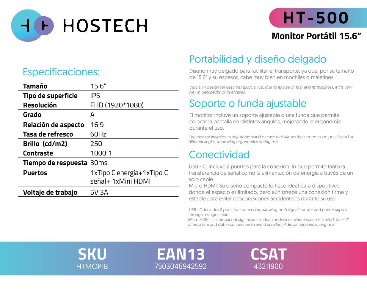 Monitor Portátil Hostech HTMOP1B LED 15.6″ – 1920 x 1080 FHD, G-Sync/FreeSync, HDR, Panel IPS, 60Hz, HDMI, Dp, 4MS, Altavoces Incluidos, Negro