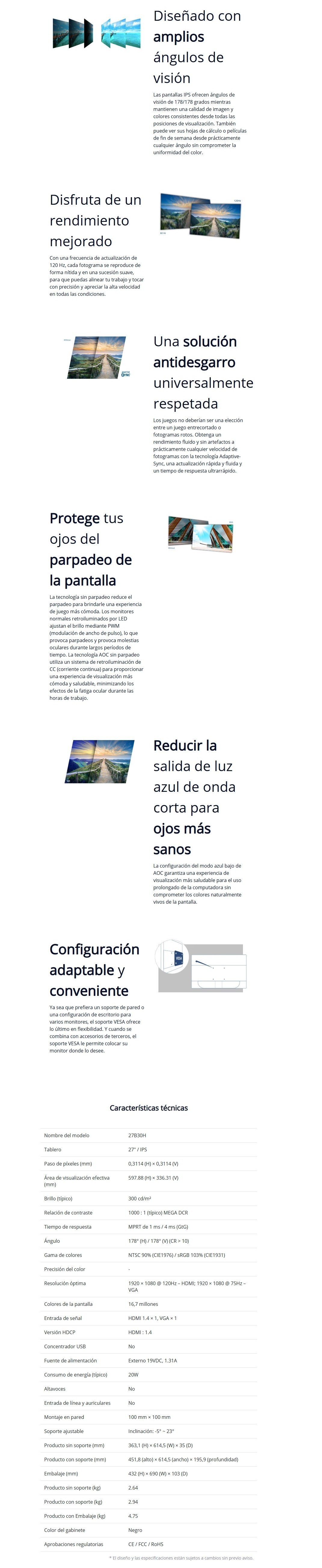 Monitor Profesional AOC 27B30H LED 27″ – 1920 x 1080 FHD, Adaptive Sync, Panel IPS, 120Hz, HDMI, VGA, 1MS, Vesa, Sin Bordes, Negro
