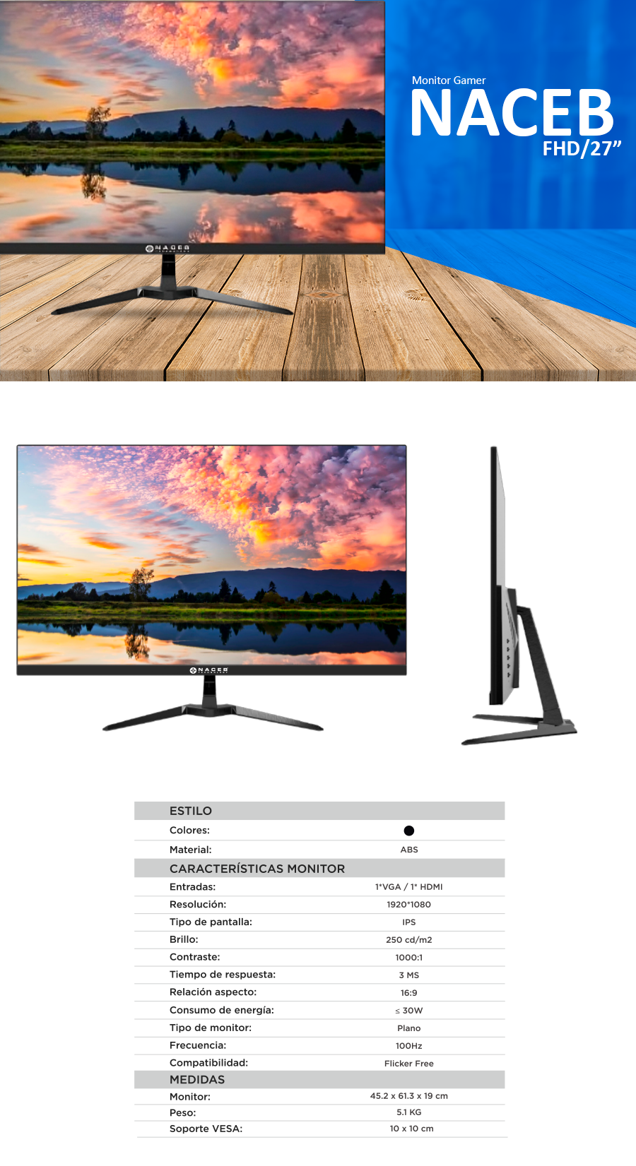 Monitor Profesional Naceb NA-0642 LED 27″ – 1920 x 1080 Full HD, Panel IPS, 100Hz, HDMI, VGA, 3MS, Vesa, Sin Bordes, Negro