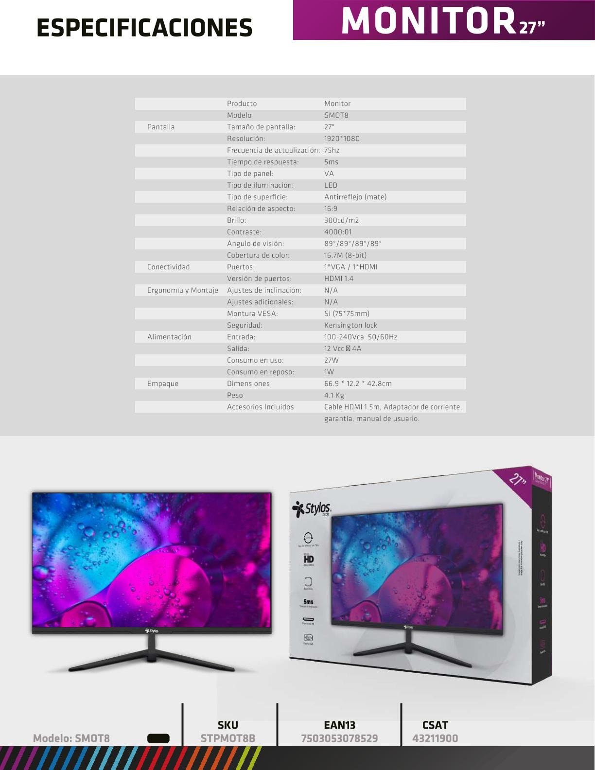 Monitor Profesional Stylos STPMOT8B 27″ – 1920 x 1080 Full HD, Panel VA, 75Hz, HDMI, VGA, 5MS, Vesa, Sin Bordes, Ultra Slim, Negro