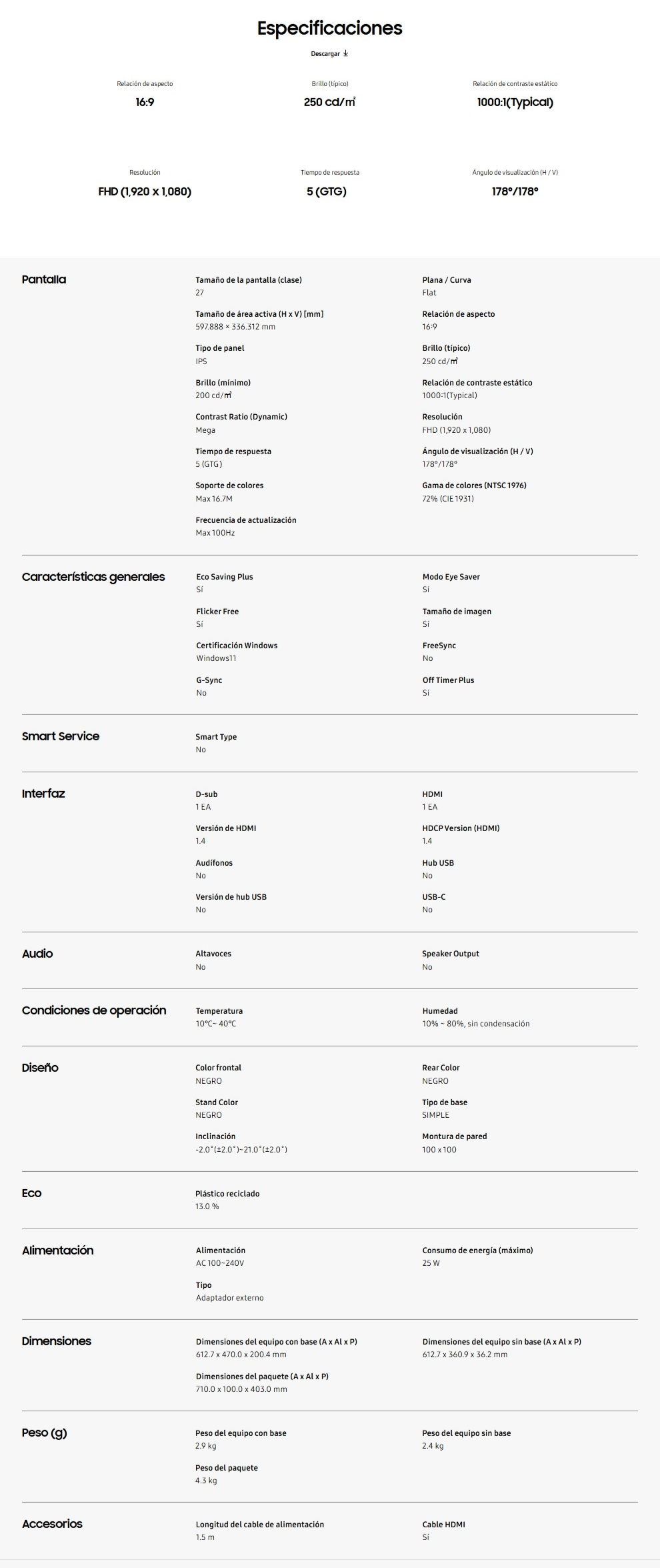 Monitor SAMSUNG S3 LCD 27″ – 1920 x 1080 Full HD, Modo Eye Saver, Panel IPS, 100Hz, Hdmi, Vga, 5MS, Vesa, Sin Bordes, Ultra Slim, Negro