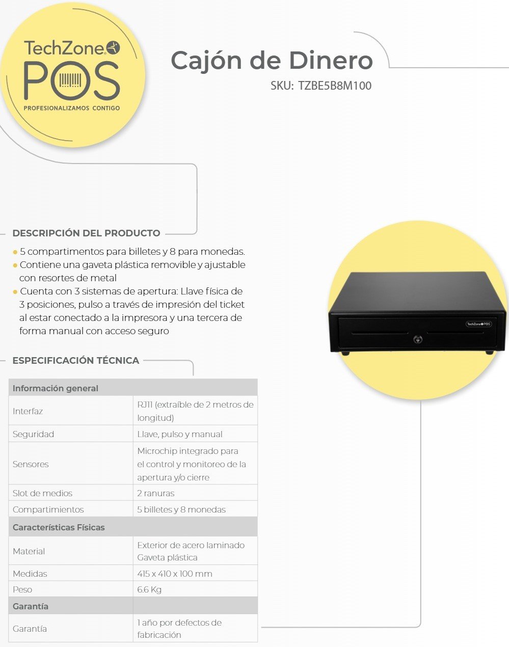 Cajón De Dinero TECHZONE / Con Llave, Pulso Y Manual / Compartimiento Para 5 Billetes Y 8 Monedas De Distinta Denominación / RJ11 / Color Negro
