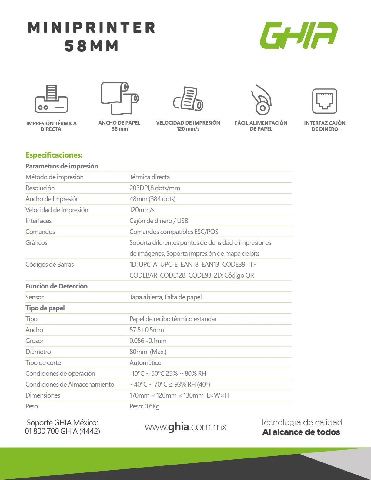Impresora Térmica Directa GHIA GTP582 / Usb / 58mm/100mm/s / Auto corte / Alámbrico / Negra / GTP582