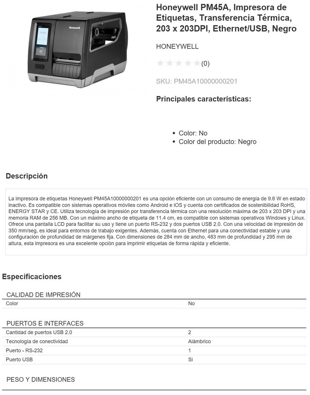Impresora Térmica HONEYWELL PM45A / Térmica / ETHERNET, USB / 203X203 DPI / 350 MM/s / Pantalla LCD / Alámbrica / Negro