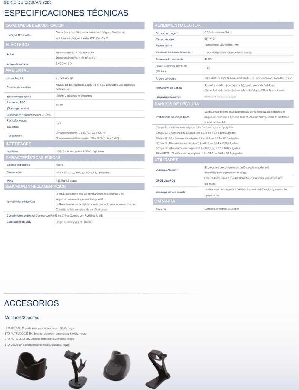 Lector De Código De Barras DATALOGIC QD2220 / Alámbrico / Láser / Censor CMOS / 1D / Incluye Cable USB Y Base / Ligero Para Uso Continuo / IP42 / Color Negro